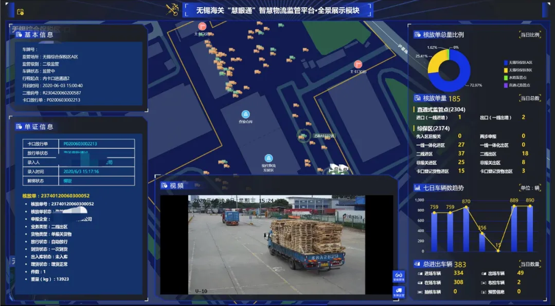 無(wú)錫綜保區(qū)項(xiàng)目利用電子圍網(wǎng)技術(shù),將GPS定位與地理信息系統(tǒng)、掌上物流、視頻智能比對(duì)、卡口自動(dòng)識(shí)別、數(shù)據(jù)多維分析等多項(xiàng)技術(shù)相結(jié)合,形成“虛擬圍網(wǎng)監(jiān)管”。司機(jī)駕駛運(yùn)載車輛到達(dá)綜合保稅區(qū)后,即通過高清攝像頭完成“卡口自動(dòng)識(shí)別”,“慧眼通”系統(tǒng)會(huì)根據(jù)運(yùn)載貨物、監(jiān)管方式、風(fēng)險(xiǎn)等級(jí)、預(yù)警提示、停留時(shí)間等數(shù)據(jù)的不同,直接引導(dǎo)車輛分流到指定位置,完成分類監(jiān)管、智能驗(yàn)放。若車輛離開指定路線,系統(tǒng)將實(shí)時(shí)預(yù)警,并同步向司機(jī)發(fā)送警示。